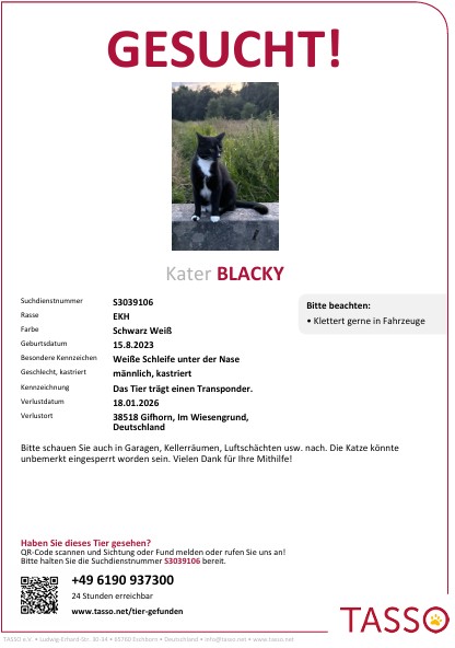 4. Februar 20264. Februar 2026Blacky in Gifhorn vermisstIn Vermisst Kater Blacky wird seit dem 18.1.2026 in Gifhorn, Im Wiesengrund, vermisst. Wenn Sie ihn gesehen haben, melden Sie sich bitte bei der angegebenen Suchdienstnummer von Tasso.