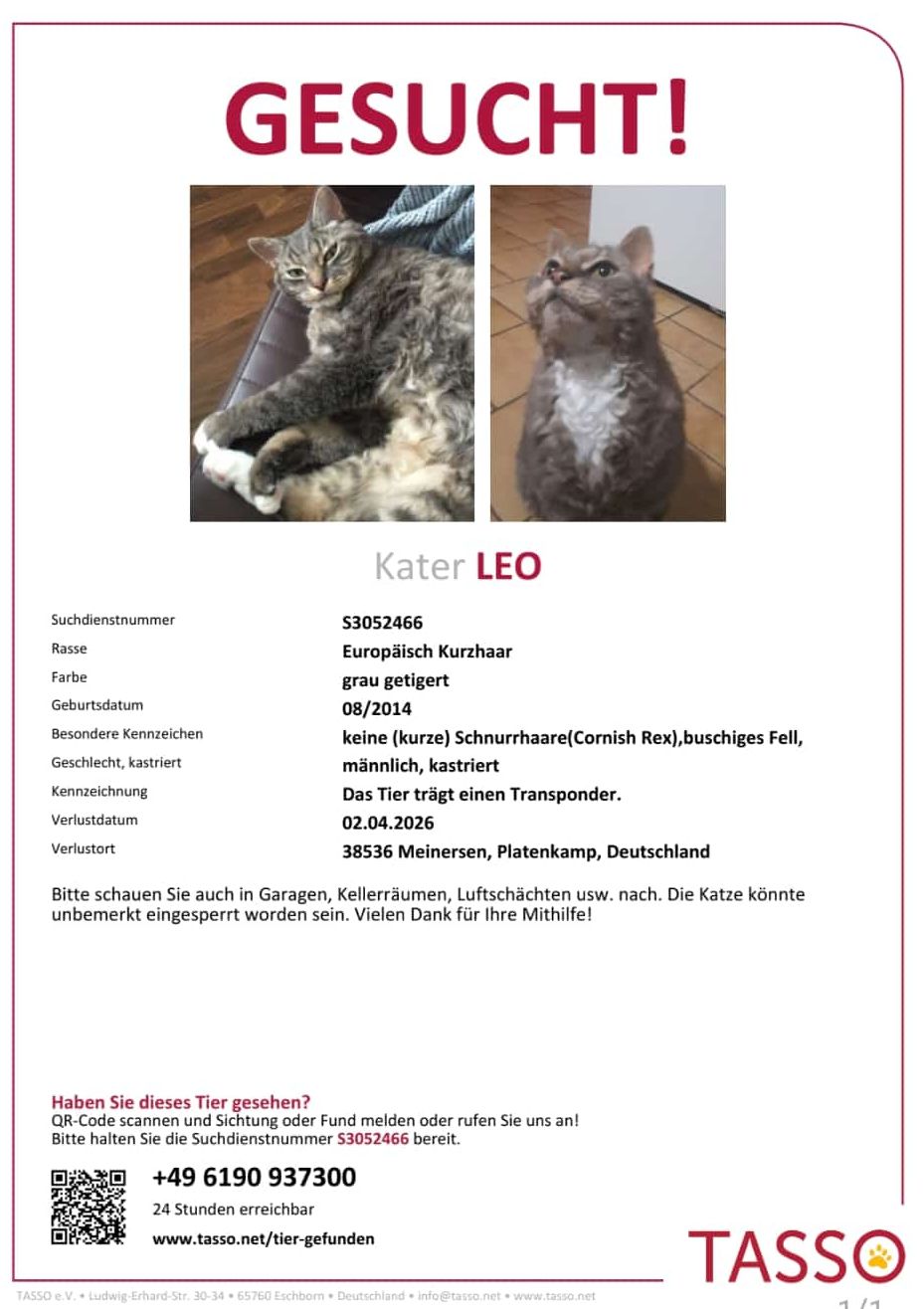 Wir vermissen seit dem 02.04.2026 unseren Kater Leo.