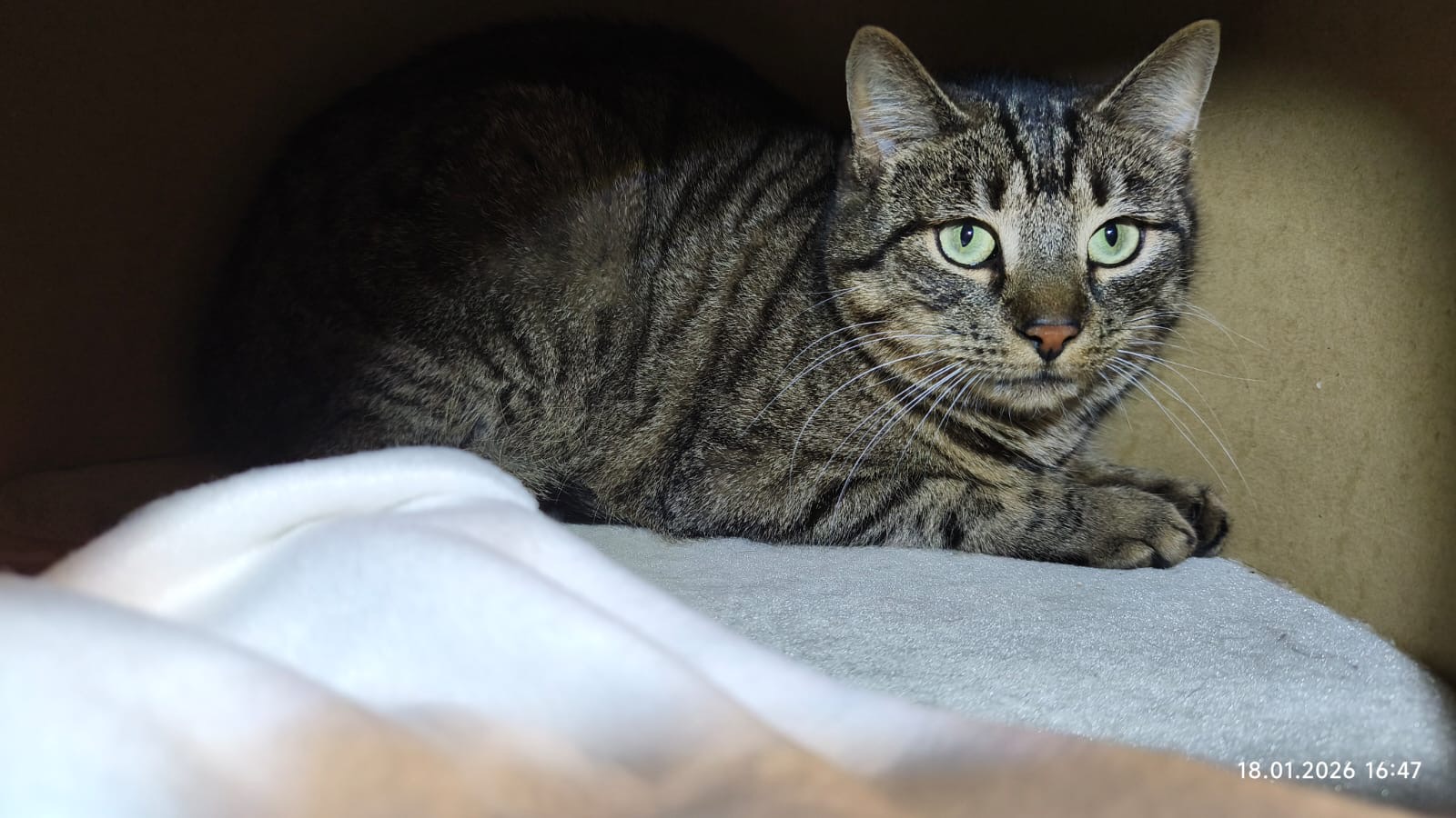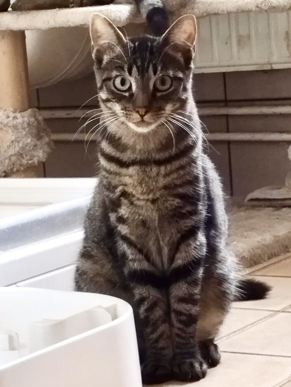 Ende Februar 2025 tauchte Chesney mit 3 weiteren Wildlingen völlig hungrig bei seinen Findern auf, wurde gesichert und umgehend kastriert. Da im Tierheim zu dieser Zeit kein Platz für sie war, kamen die Kitten in eine Pflegefamilie, um sie an den Kontakt zu Menschen zu gewöhnen. Sie konnten leider nicht wieder zurück an ihren Fundort, da in der Nachbarschaft mehrere Wach- und Jagdhunde unterwegs sind. Vor Kurzem sind die 4 ins Tierheim gekommen, damit wir ein richtiges Zuhause für sie finden können.