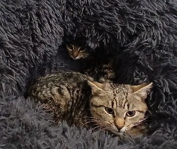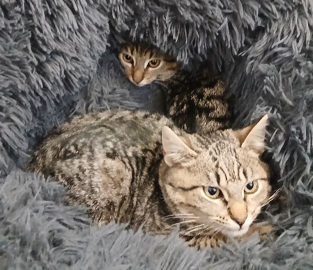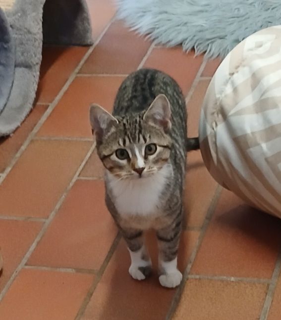 Ellie, Chilli, Pommes & Majo stammen von einem Hot Spot unkastrierter, menschenscheuer Katzen. Sie wurden gesichert, um sie zu kastrieren. Anfangs waren sie recht spuckig und wollten mit uns nicht viel zu tun haben. Inzwischen kann man sie aber alle anfassen, obwohl sie noch nicht so recht einordnen können, ob sie das gut finden. Sie machen aber täglich Fortschritte. Ellie war die erste, die ihr Misstrauen abgelegt hat, sich gern streicheln lässt und einem mitunter auf die Schultern hüpft und laut anfängt zu schnurren.