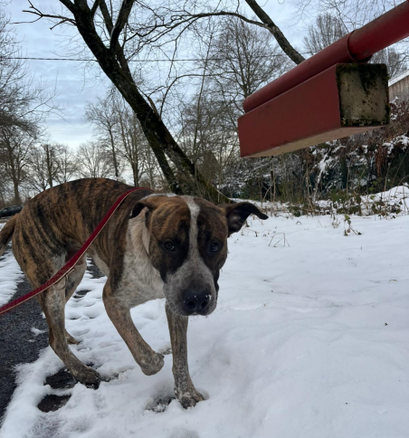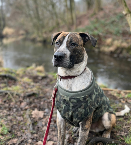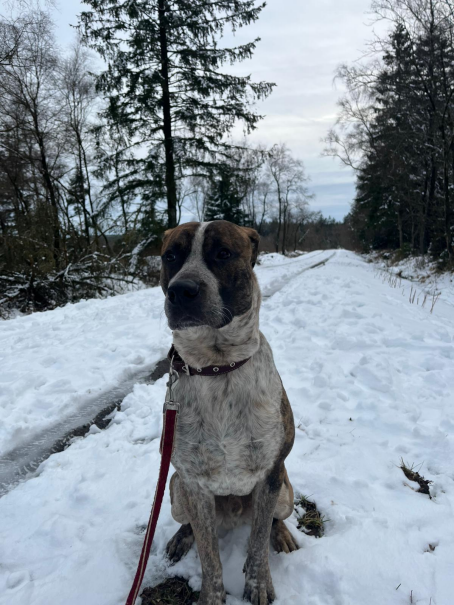 Jo wird im April/Mai ein Jahr alt und ist ein wunderschöner Mischling aus American Staffordshire Terrier, Schäferhund und weiteren Rassen. Trotz seiner kraftvollen Optik ist er vom Wesen her eher ein sensibler, anhänglicher Familienhund – manchmal gefühlt mehr Malteser als „Kampfhund“.